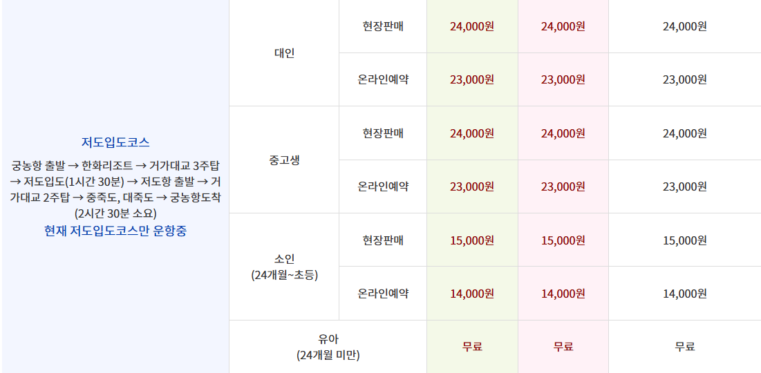 - 탑승 요금: 유람선 요금 + 입도료 포함 (업체마다 상이)