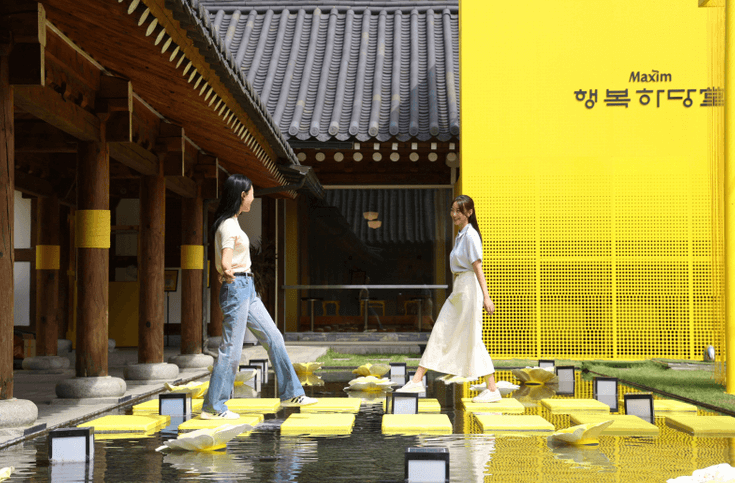 입구 ‘환대문’을 지나면 ‘어서오소’, ‘맛있당’, ‘행복하당’, ‘가배뜰’, ‘맥심이당’ 등 재치 있는 이름의 공간들이 순서대로 이어집니다.