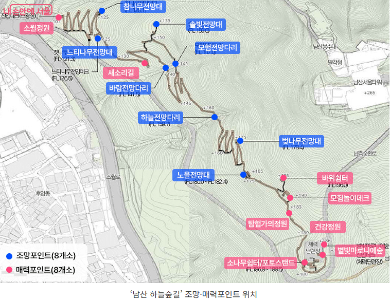 - 남산하늘숲길은 서울특별시 용산구 내 남산 일대에 조성된 무(無)장애 산책로입니다.