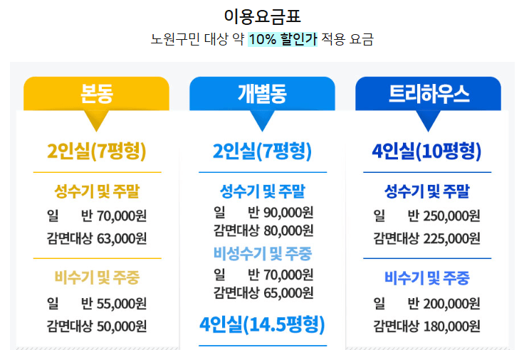 | 가격대(성수기) | 약 25만 원 | 2인실 7만 원, 6인실 18만 원 |