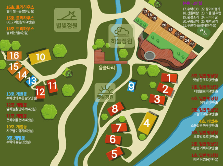- 🛌 객실: 18개 동, 25개 객실 / 최대 80명 수용