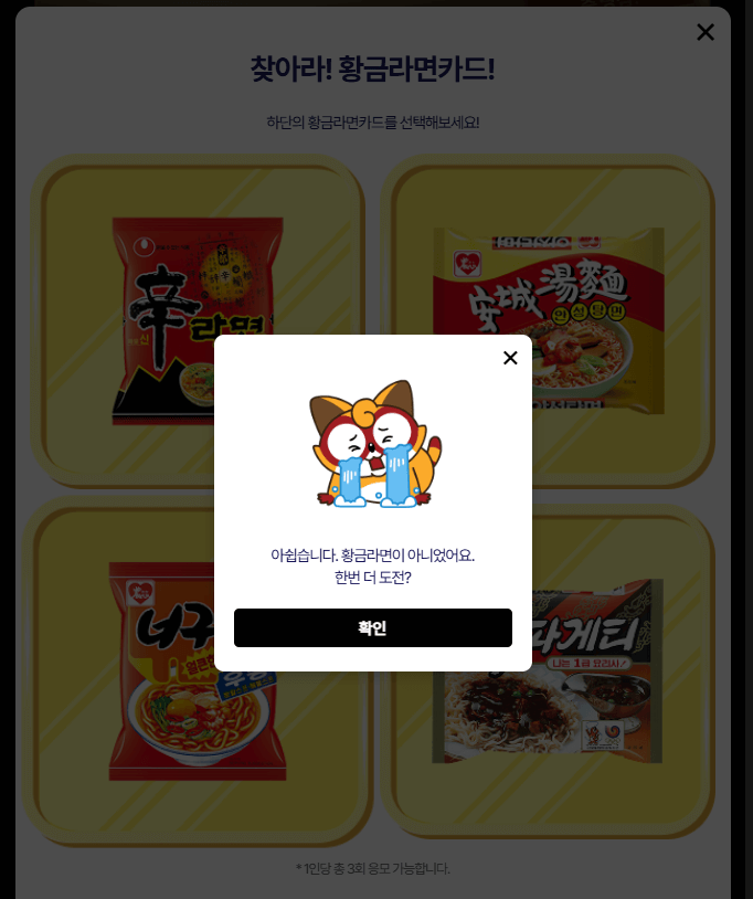 • 4가지 라면 중에 선택 하면 당첨/ 미당첨 확인 가능