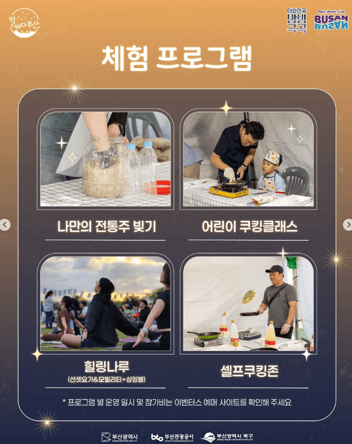 - 체험 프로그램 예시: 나만의 전통주 빚기, 전 만들기, 어린이 쿠킹 클래스, 선셋요가 등