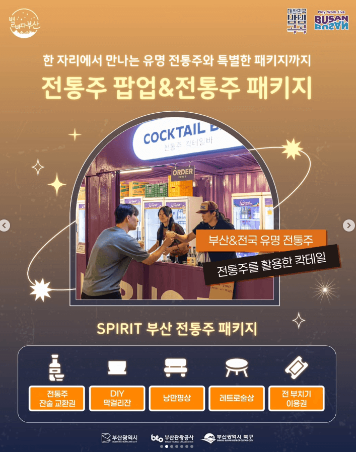 - 전통주 팝업 부스 (“스피릿 부산”): 부산 대표 전통주 + 전국 전통주, 전통주 활용 칵테일 등