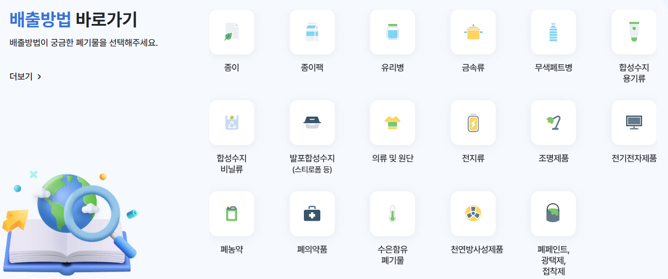 - 환경부가 공공 서비스 차원에서 만든 공식 누리집으로, 일상생활에서 자주 나오는 730개 품목의 분리배출 방법을 쉽게 정리해두었어요.