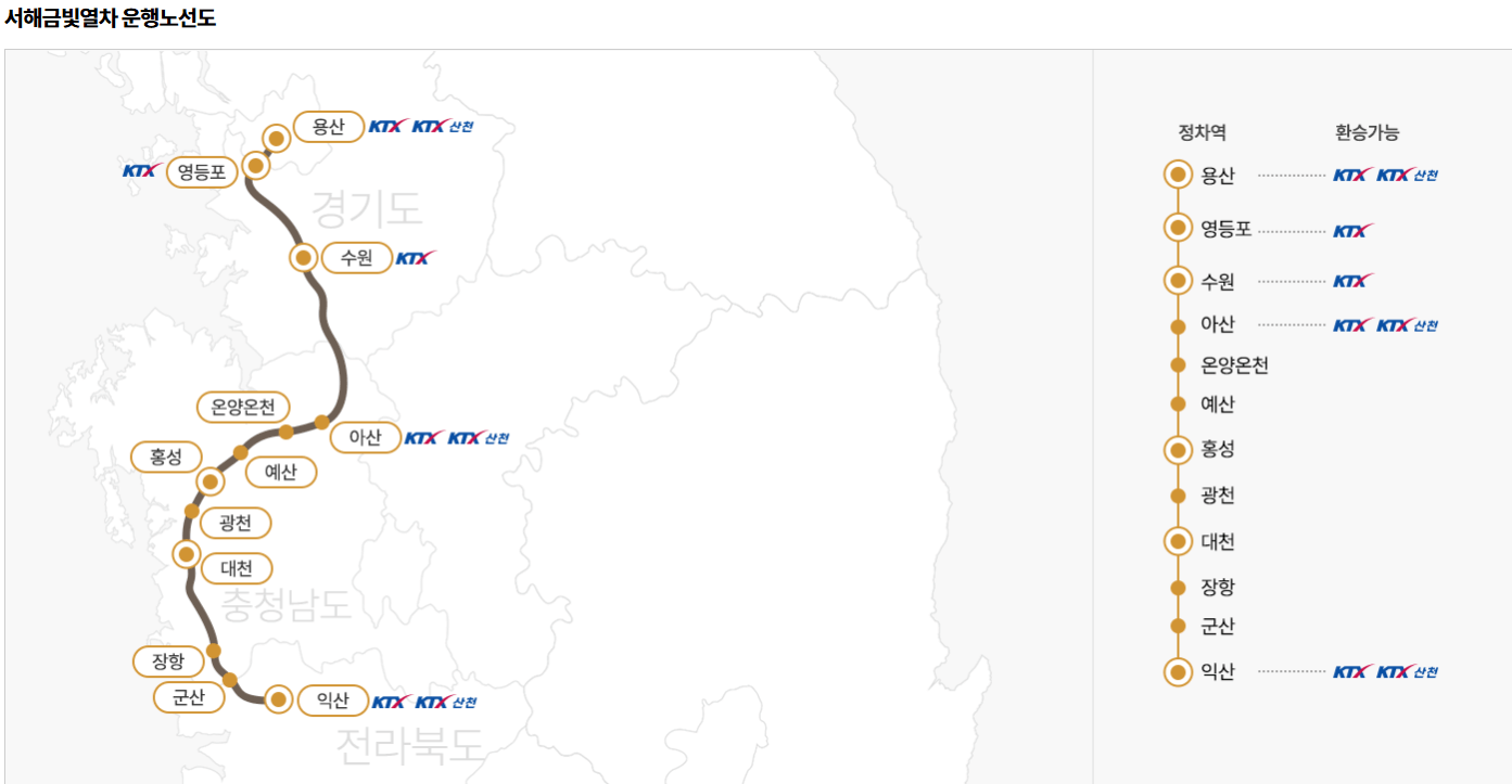 - 주요 정차역: 수원, 아산, 온양온천, 예산, 대천, 군산 등