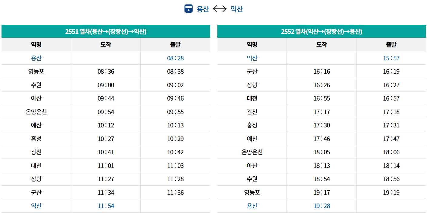 - 하행 (용산 → 익산): 08:32 출발, 11:58 도착