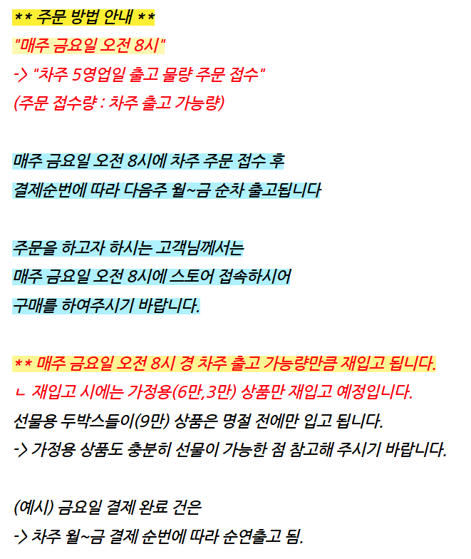 - 온라인 구매 - 매주 금요일 오전 8시, 스마트스토어에서 한정 수량으로 판매