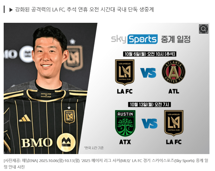 - 10월 6일 (추석 당일): 오전 10시에 손흥민 LAFC 경기 생중계 확정