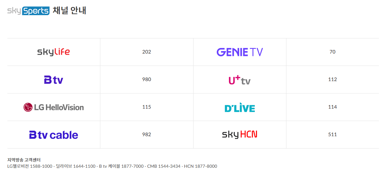 다음은 주요 TV 서비스별 스카이스포츠 채널 번호입니다.