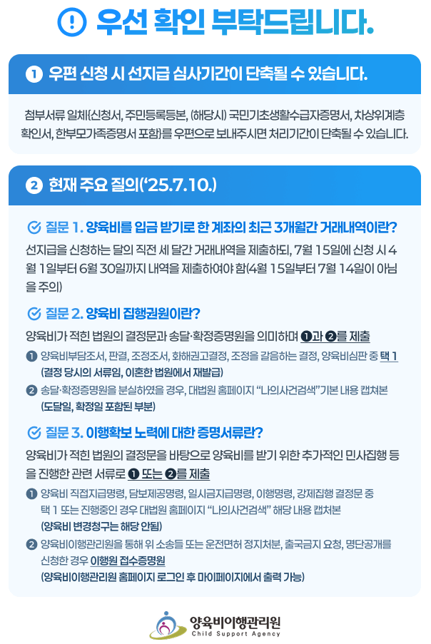 - 우편 신청: 서울특별시 중구 퇴계로 173, 24층 양육비이행관리원 선지급 담당자 앞
