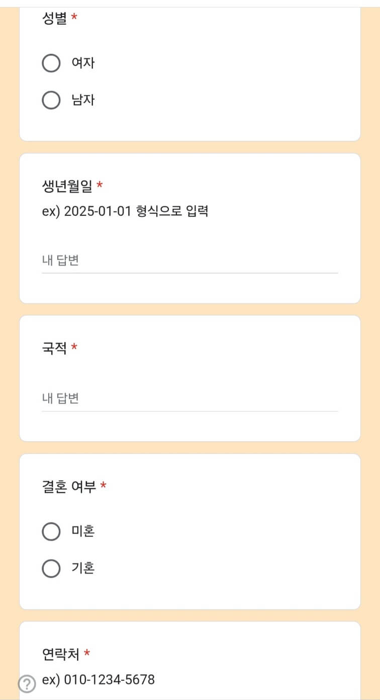 - 건강 상태, 만성질환 여부, 동반 신청자 여부 등