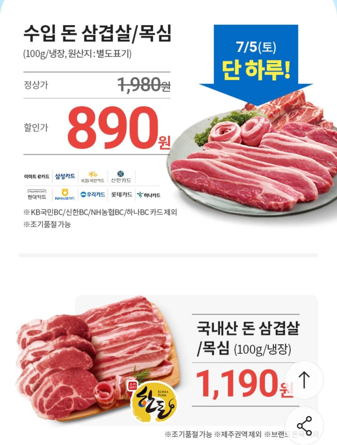 - 삼겹살 100g 890원 = 행사 카드 결제 시 전용 할인