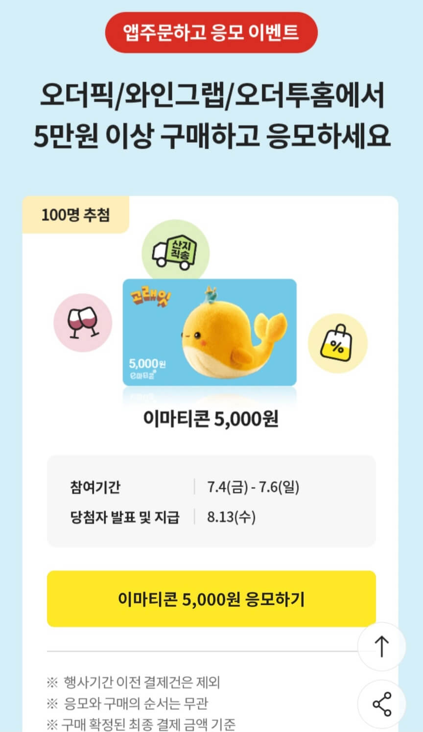 - 10만 원 이상 결제 후 응모 시, 선착순 150,000명 대상 지급 (7/11부터 사용 가능, 7/24까지 유효)