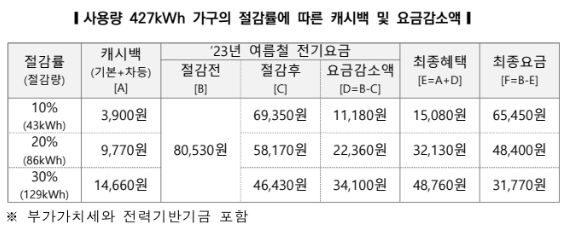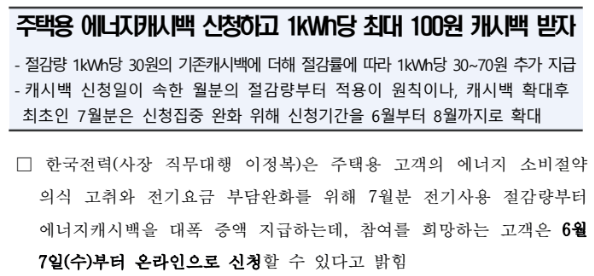 - 내용: 전년 동일 기간 대비 3% 이상 전기 사용량을 줄이면, 절감량에 비례하여 1kWh당 최대 100원까지 전기요금에서 차감되는 캐시백 형태로 제공