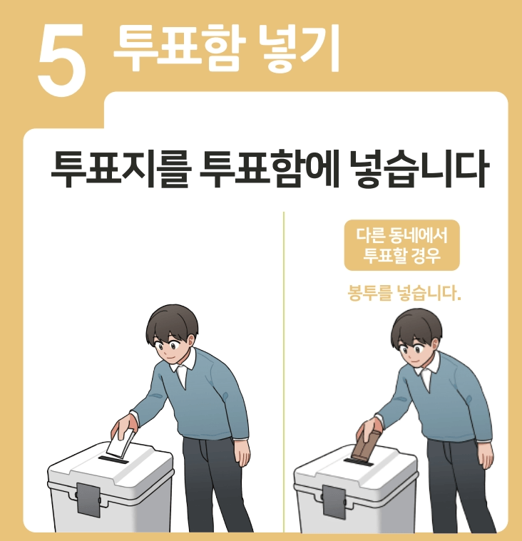 - 관내선거인: 해당 구·시·군위원회 관할구역 내에 주소를 둔 유권자는 투표용지를 수령한 후 기표소에서 기표하고, 투표지를 접어 관내투표함에 투입합니다.