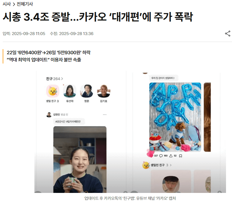 업데이트 발표 후 카카오 주가가 하락한 뉴스도 나왔는데요, 이는 일반 사용자 불만이 기업 신뢰도에도 영향을 미쳤다는 해석이 나옵니다.