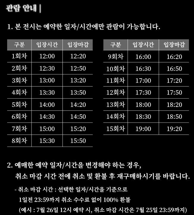 - 환불/취소: 관람일 하루 전까지 100% 환불 가능