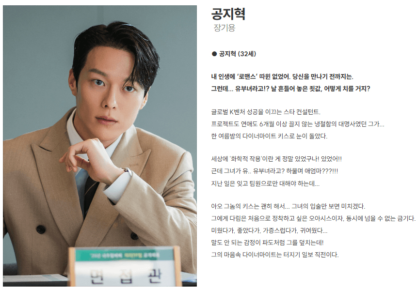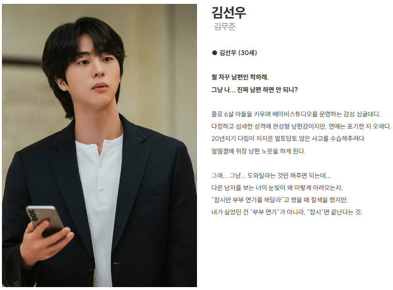 생계를 위해 ‘애엄마이자 유부녀’로 위장해 취업한 싱글녀. 키스를 계기로 팀장인 공지혁과 얽히며 복잡한 감정을 겪게 됩니다. - 김무준 → 김선우 (30세) 역