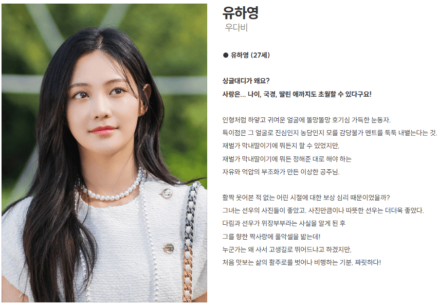 재벌가 막내딸이자 선우를 짝사랑하는 인물. 위장 관계 속에서 감정선이 복잡하게 얽힙니다.