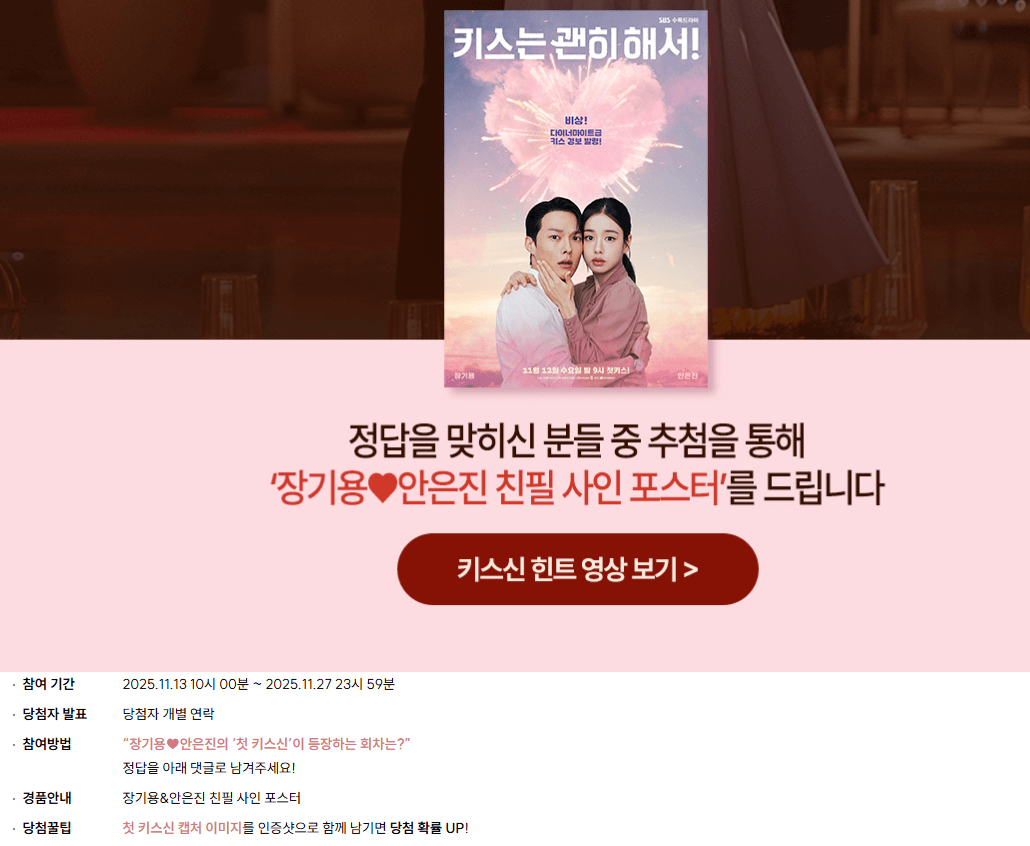 - 정답 댓글을 공식홈페이지에 남기면 추첨을 통해 배우 친필 사인 포스터를 증정하는 이벤트