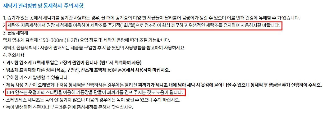 - 세탁 후 뚜껑을 열어 내부를 건조시키면 곰팡이 예방 효과가 큽니다.