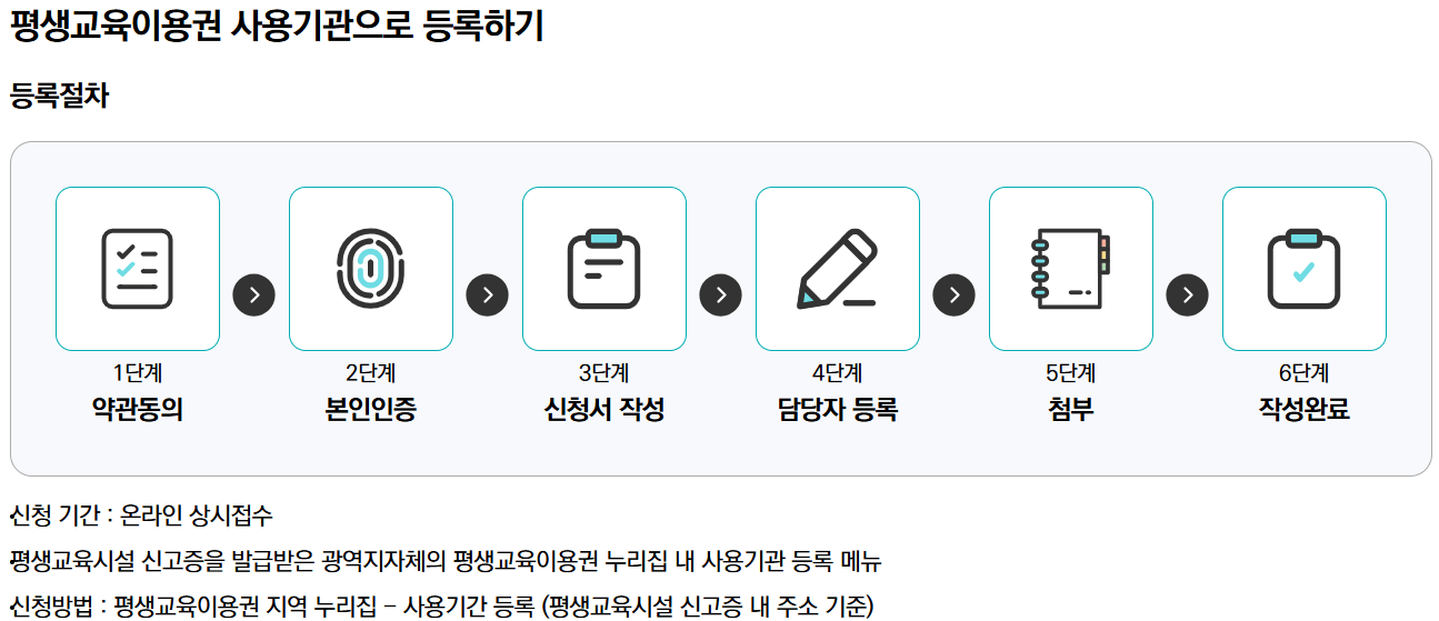 1 | 📌 온라인 신청: 지자체 또는 평생교육이용권 홈페이지 접속 → 약관 동의, 본인인증, 신청서 작성, 자격 증빙 및 (선택)학습계획서 제출 |
