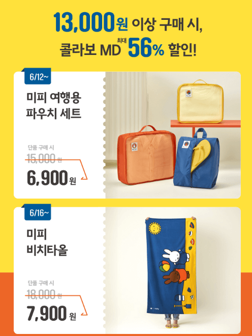 - 할리스 음료나 일반 MD 포함하여 총 13,000원 이상 결제 시, 여행용 파우치 세트, 우양산, 비치타월을 최대 56% 할인된 가격에 구매 가능