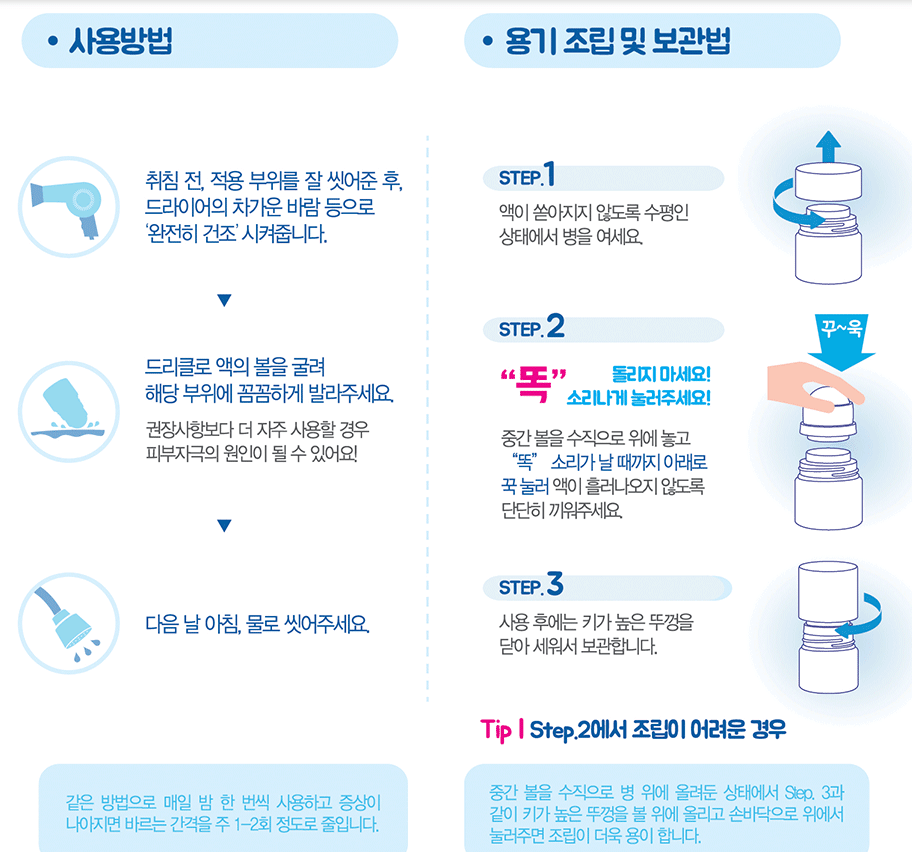 | 사용법 | 저녁에 건조한 피부에 바르고 아침에 씻어내는 방식 | 드리클로와 동일 – 취침 전, 건조 상태, 아침 세척 |