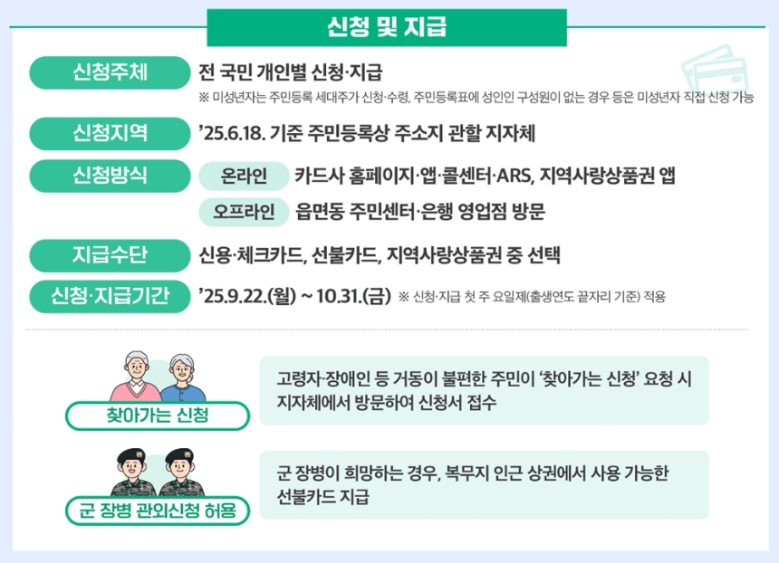 | 신청 후 지급은 언제 되나요? | 신청 완료 후 카드 충전 또는 상품권 발급 등 방식에 따라 시차가 있을 수 있으므로 카드사나 지자체 안내를 참고하세요. |