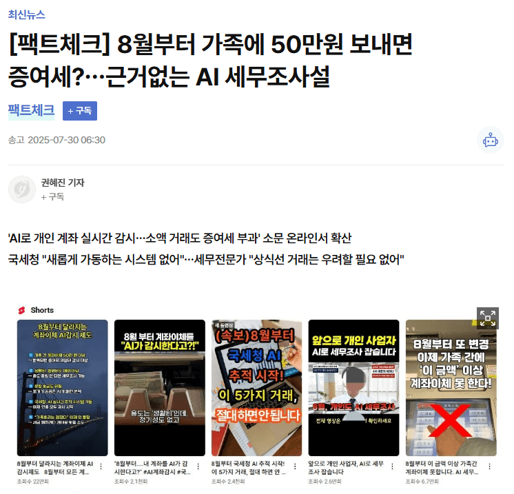 최근 온라인 커뮤니티와 유튜브 등에서 “가족 간 계좌이체 50만 원 이상도 증여세가 부과된다”, “8월부터 국세청이 AI로 모든 계좌를 들여다본다”는 내용이 빠르게 확산되고 있습니다.
