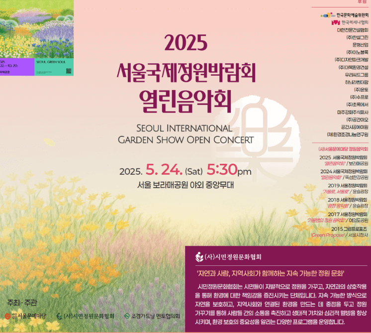 - 주최/주관: 서울특별시, 서울국제정원박람회 조직위원회, 환경과조경, 동아일보