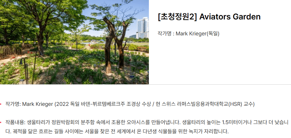 - 111개의 테마 정원: 국내외 작가, 시민, 학생 등이 참여하여 다양한 정원을 조성합니다.