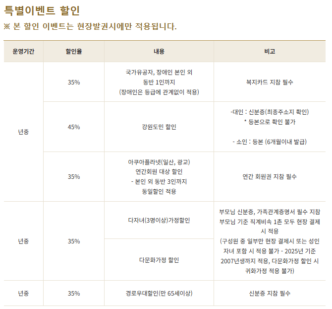 - 강원도민 할인 45%, 국가유공자·장애인 할인 35% (동반 1인까지 적용)