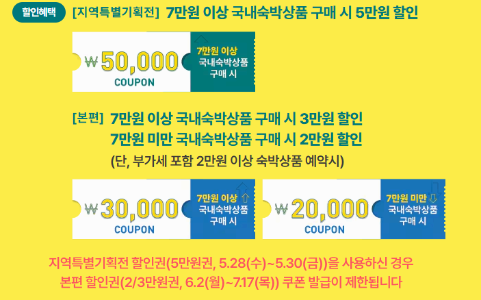 - 지역특별기획전: 7만 원 이상 숙박 시 5만 원 할인