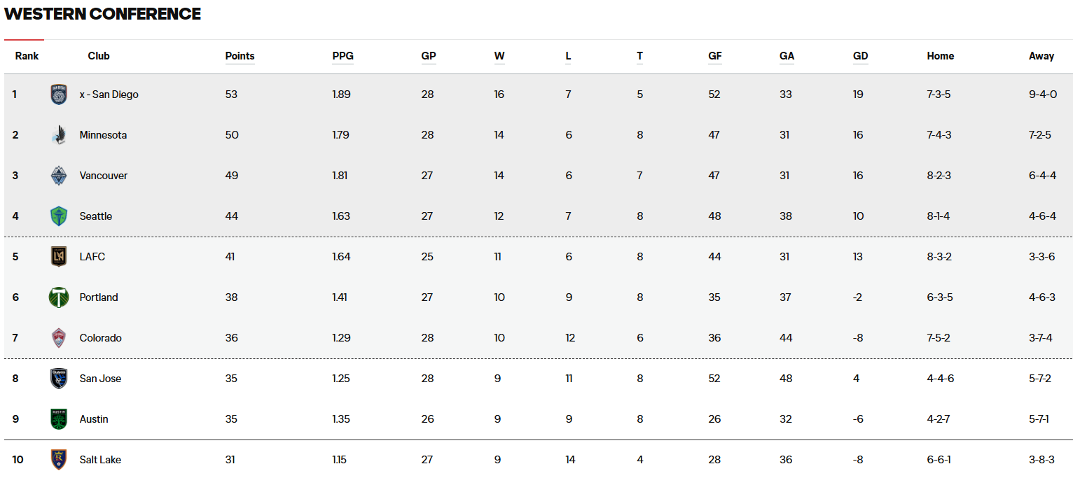- MLS순위2025 기준, 샌디에이고 FC가 서부 콘퍼런스 1위.